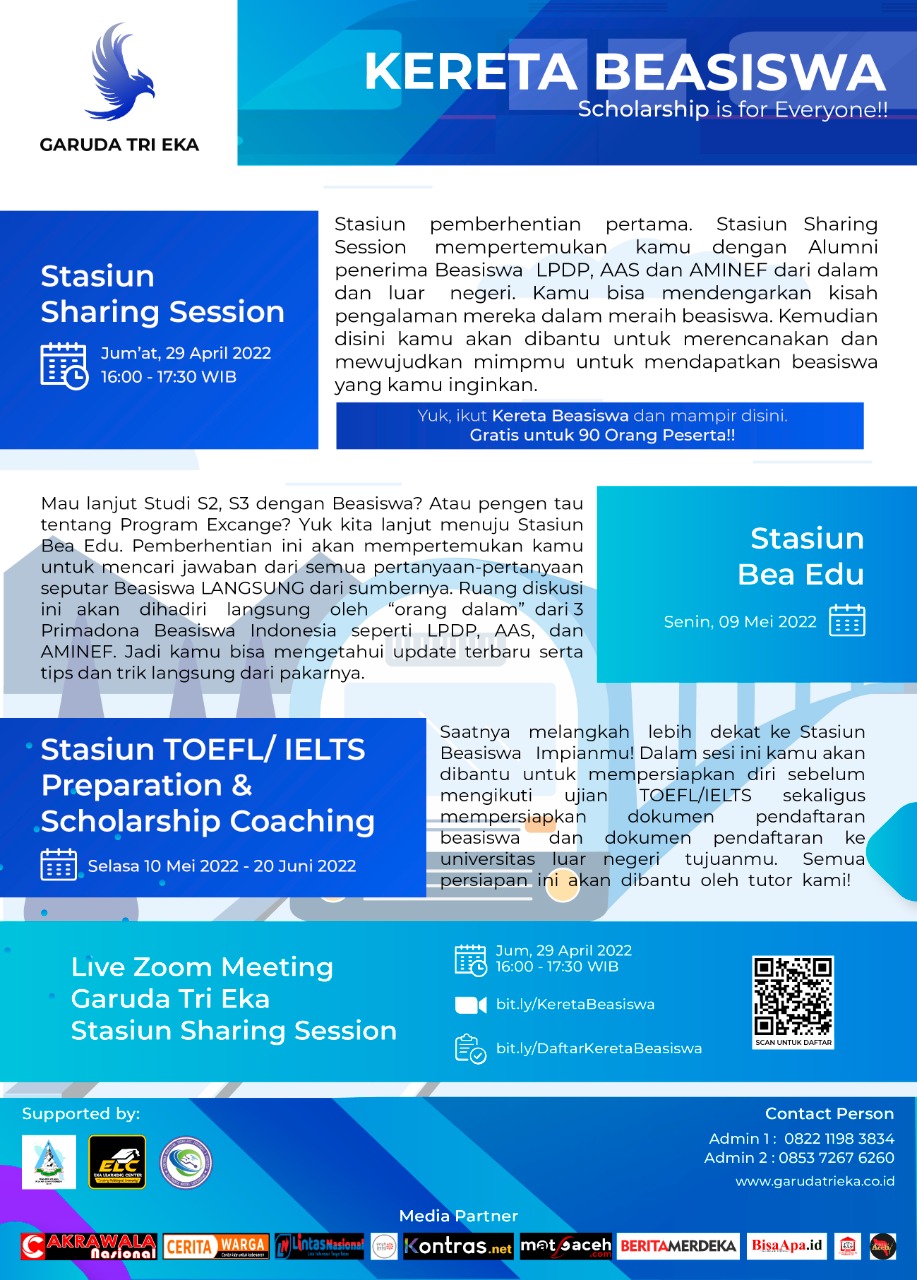 Garuda Tri Eka berterimakasih kepada seluruh Media Partner yang telah menyebarkan informasi ini untuk membantu para pejuang beasiswa untuk memajukan daerahnya masing-masing.