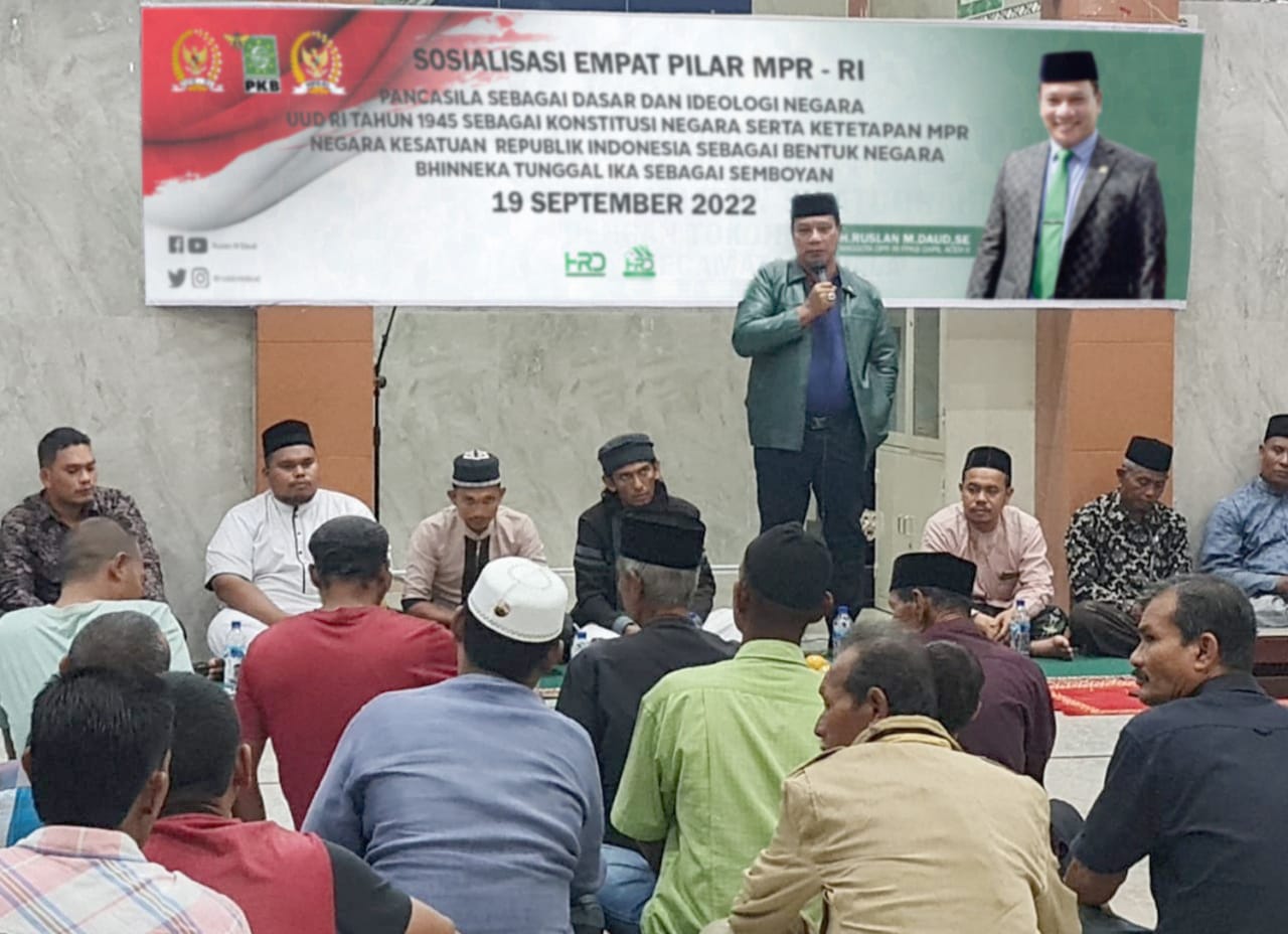 LINTAS NASIONAL – BIREUEN, Anggota DPR RI Fraksi Partai Kebangkitan Bangsa (F-PKB), H Ruslan M Daud (HRD), sosialisasi empat pilar kebangsaan di Rumah Aspirasi HRD, di Kabupaten Bireuen, Senin 19 September 2022.