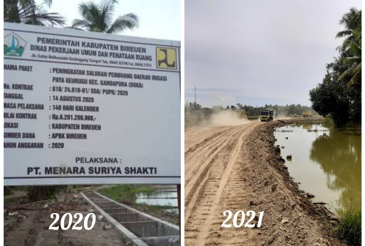LINTAS NASIONAL – BIREUEN, Peningkatan Saluran Pembuang Daerah Irigasi Paya Geurugu, Kecamatan Gandapura Bireuen, yang dikerjakan PT. Menara Suriya Shakti yang berada di Dinas Pekerjaan Umum dan Penataan Ruang (PUPR) Kabupaten Bireuen dengan nilai kontrak Rp 6,2 Miliar menjadi temuan Badan Pemeriksa Keuangan Perwakilan (BPKD) Aceh.
