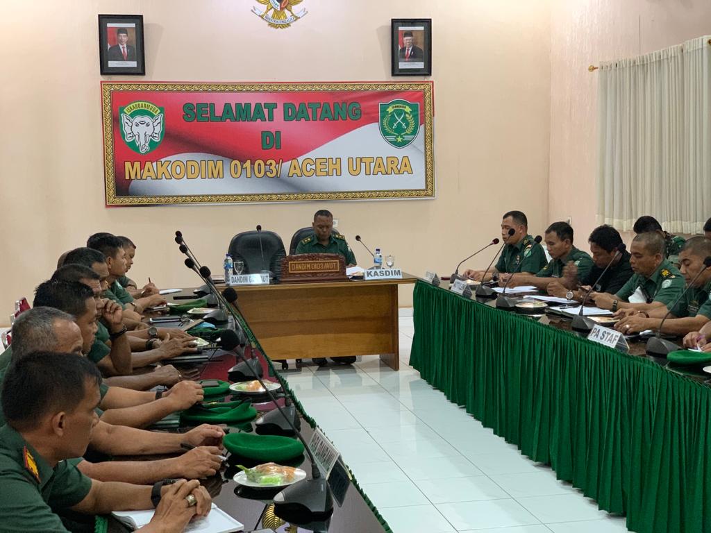 Sidang dihadiri para Perwira Seksi dan Danramil jajaran Kodim 0103/Aut yang dilaksanakan di Aula Yudha Makodim Setempat, Kamis, 12 Mei 2022