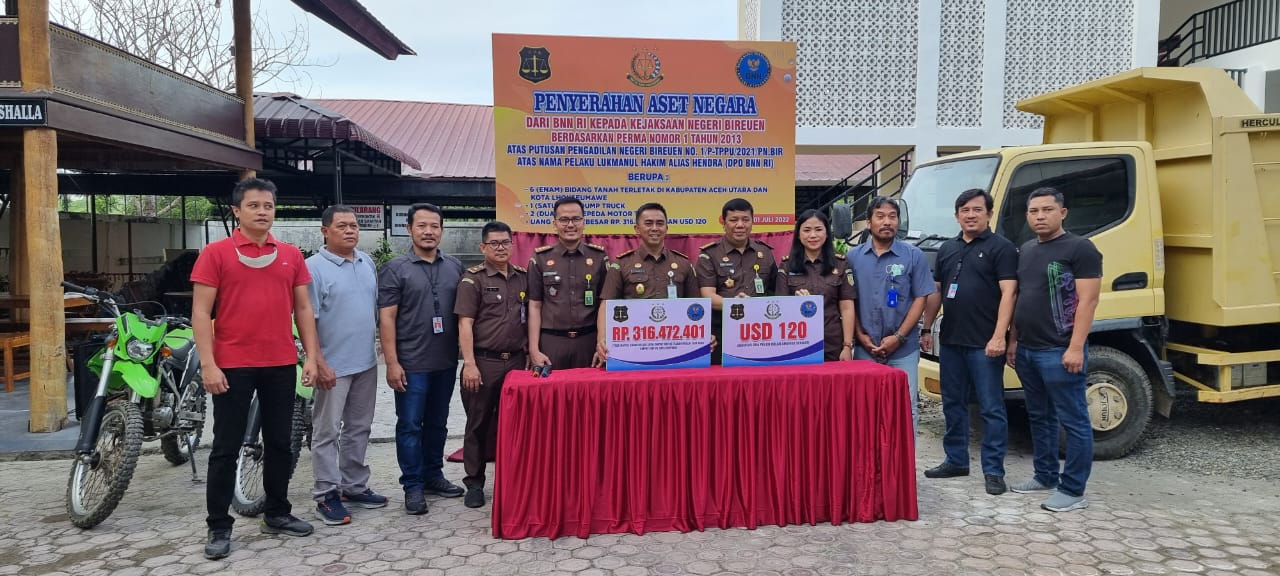 Aset hasil Tindak Pidana Pencucian Uang (TPPU) itu diserahkan langsung oleh Kepala BNN RI diwakili oleh Penyidik Madya Dit TPPU Kompol Dr. (C) SF. Aritonang S.Sos MH kepada Kepala Kejaksaan Negeri (Kajari) Bireuen Moh. Farid Rumdana SH, MH didampingi Kasi Pengelolaan Barang Bukti dan Barang Rampasan Lili Suparli SH didampingi oleh Tim Pusat Pemulihan Aset Kejaksaan Agung RI Dr (c) Asep Kurniawan Cakraputra SH dan Penyidik Muda DIT TPPU BNN RI AKP Purwanta SH.