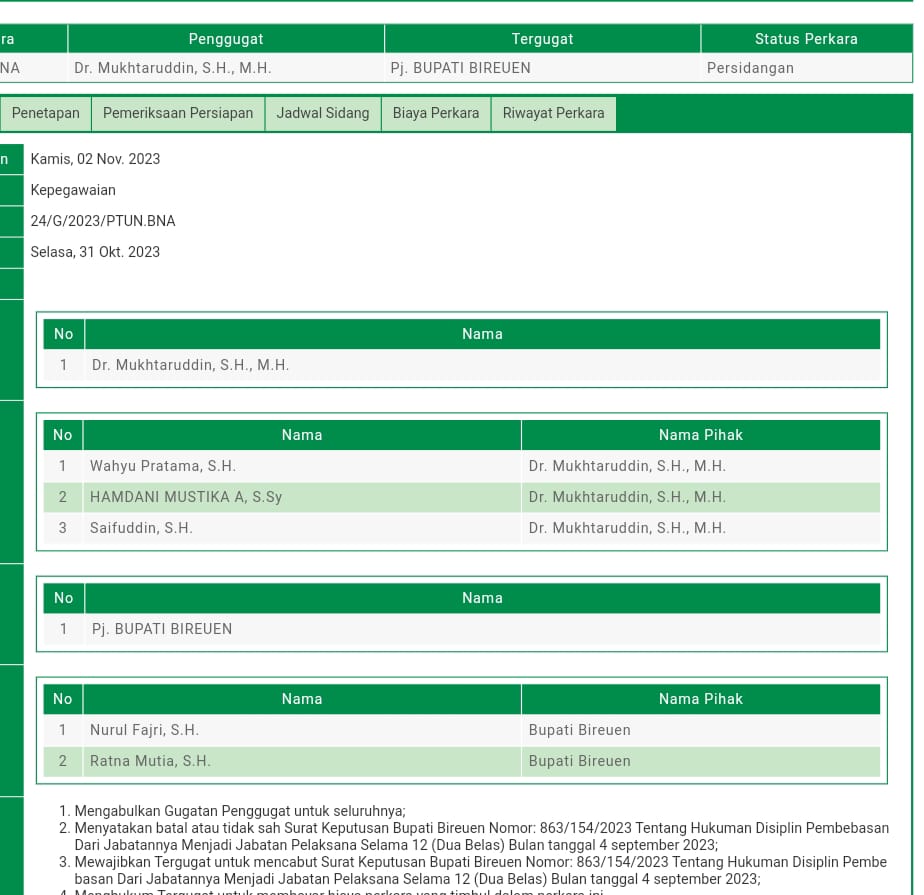 Berdasarkan penelusuran media ini pada Jumat 24 November 2023, melalui https://sipp.ptun-bandaaceh.go.id gugatan tersebut didaftarkan pada Kamis 2 November 2023 dengan nomor perkara 24/G/2023/PTUN. BNA Tanggal Surat Selasa, 31 Okt. 2023
