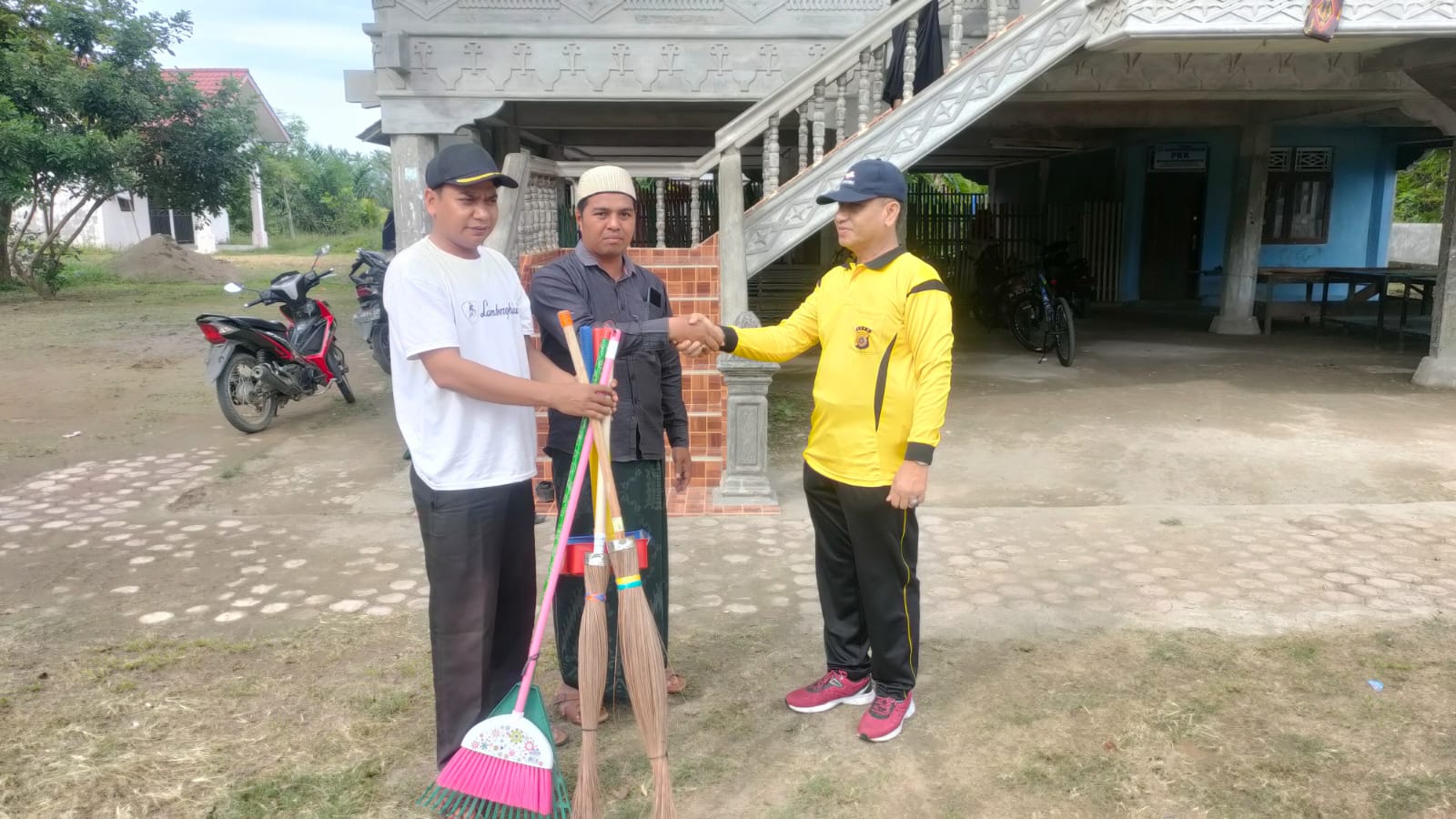 LINTAS NASIONAL – LHOKSEUMAWE, Program Jumat Amal Dewantara (Juara), Polsek Dewantara Kabupaten Aceh Utara menyerahkan alat kebersihan di Gampong Geulumpang Sulu Timu pada Jumat 17 Juni 2022
