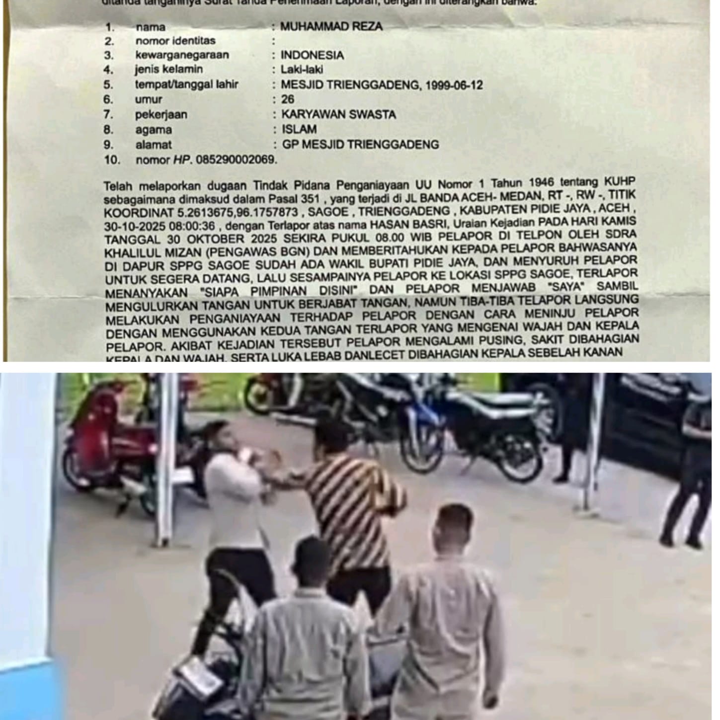 LINTAS NASIONAL – PIDIE JAYA, Wakil Bupati Pidie Jaya, Hasan Basri, resmi dilaporkan ke polisi atas dugaan tindak kekerasan terhadap Kepala Satuan Pelayanan Pemenuhan Gizi (SPPG) Kecamatan Trienggadeng, Muhammad Reza.